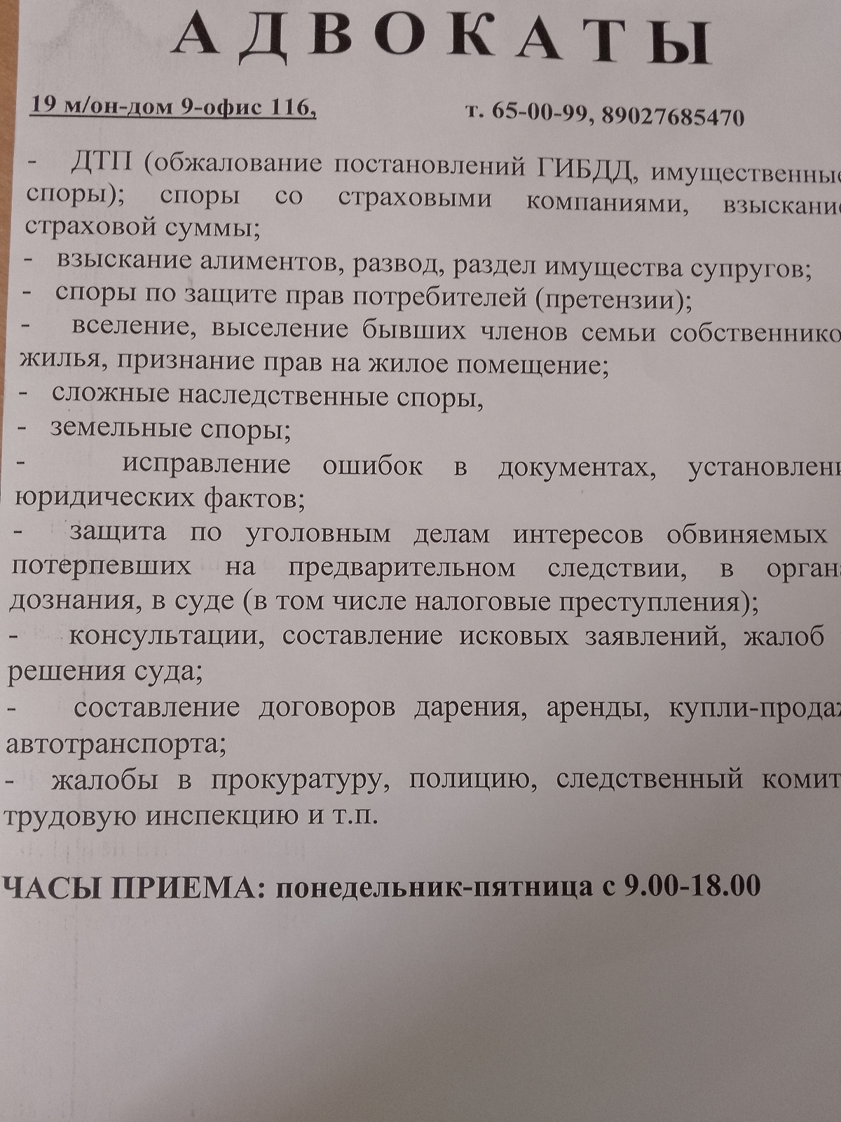 Описание: | А Д В О К А Т Ы 19 м/он-дом 9-офис 116, т. 65-00-99 89027685470 - ДТП (обжалование постановлений ГИБДД, имущественные споры); споры со страховыми компаниями, взыскание страховой суммы; - взыскание алиментов, развод, раздел имущества супругов; - споры по защите прав потребителей (претензии); - вселение, выселение бывших членов семьи собственников жилья, признание прав на жилое помещение; - сложные наследственные споры, - земельные споры; - исправление ошибок в документах, установление юридических фактов;- защита по уголовным делам интересов обвиняемых и потерпевших на предварительном следствии, в органах дознания, в суде (в том числе налоговые преступления); - консультации, составление исковых заявлений, жалоб на решения суда; - составление договоров дарения, аренды, купли-продажи автотранспорта; - жалобы в прокуратуру, полицию, следственный комитет, трудовую инспекцию и т.п. ЧАСЫ ПРИЕМА: понедельник-пятница с 9.00-18.00 |